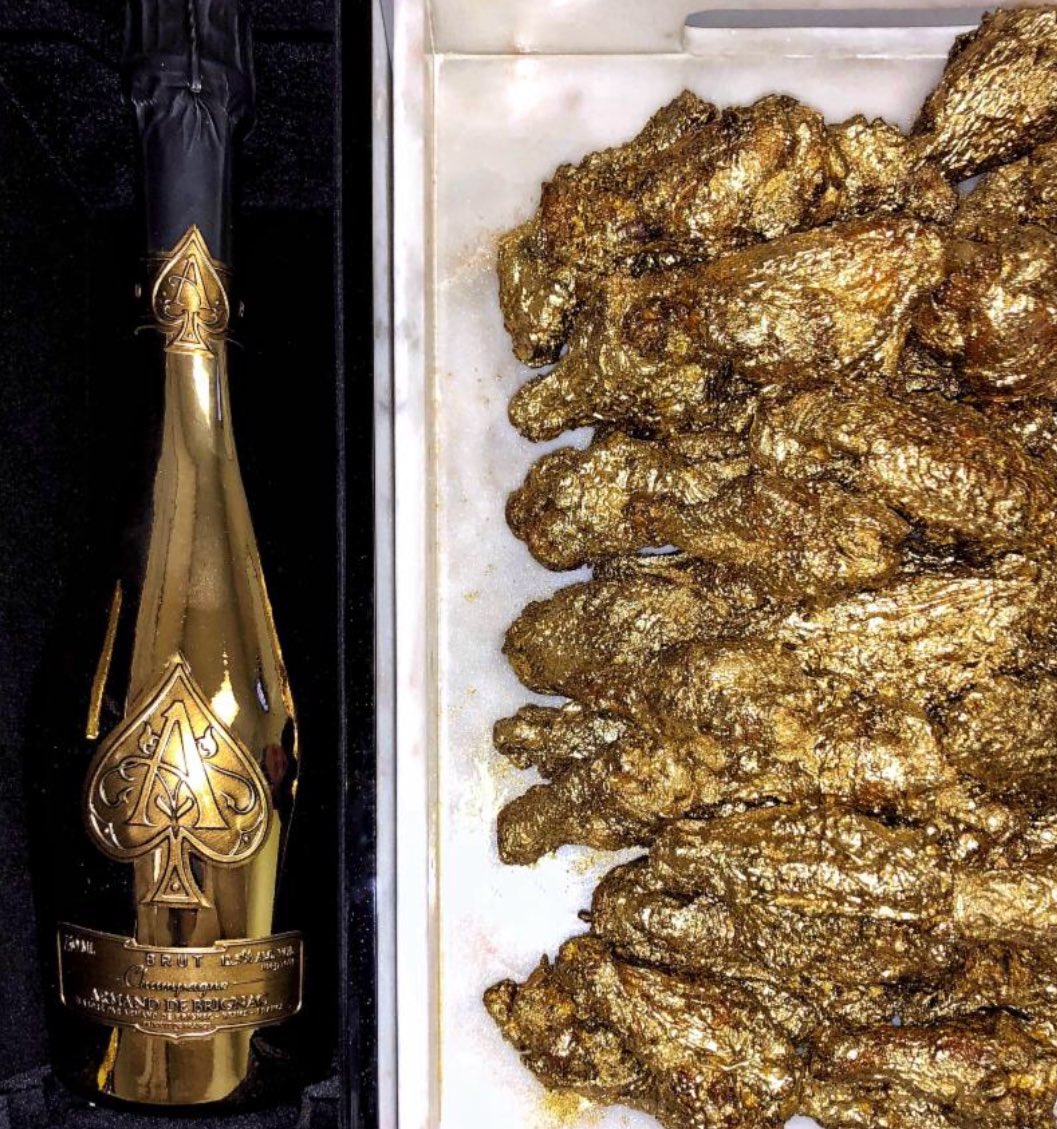 Priced at 10 pieces for 30 20 for 60 or 50 plus a bottle of Champagne Armand de Brignac for 1000 the only thing Chebans wings have in common with. 24K gold chicken wings are NYCs latest weird food craze. 10 pc 6000 - - 20pc 11000 - - 50pc served with Dom Perignon.